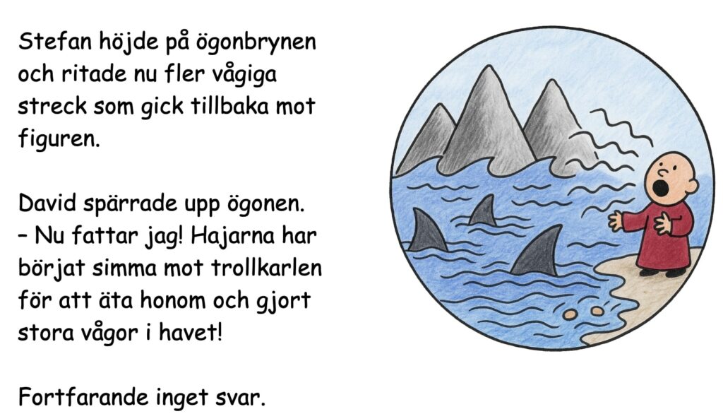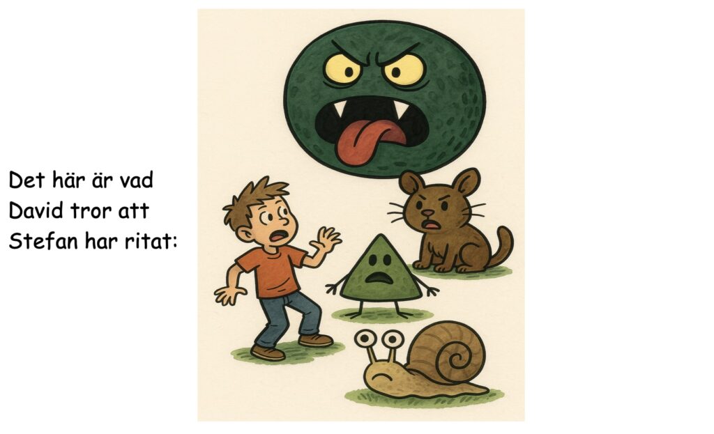Kort beskrivning: Berättelser handlar om två bröder: Stefan, som ritar något, och David, som försöker gissa vad det är. Eleverna får lyssna på berättelsen och samtidigt försöka rita det de tror att Stefan ritar – men de får bara höra och se Davids gissningar, inte veta vad Stefan faktiskt ritar.