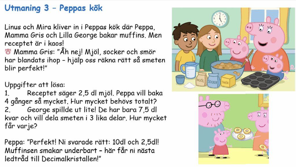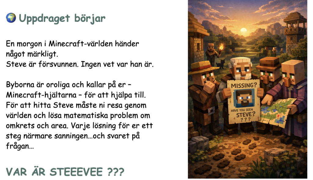 I min undervisning har jag sett hur avgörande det är att göra matematiska begrepp begripliga, levande och engagerande. För att möta elevernas behov har jag skapat egna berättelser där karaktärer som Linus och Mira hamnar i fantasifulla världar, som till exempel Frozen eller Minecraft. I dessa berättelser löser de matematiska problem i handlingen – som att räkna ut medelvärde för att balansera snöflingor eller använda multiplikation för att öppna en magisk port.